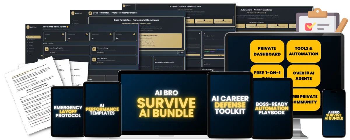 Get instant access to the Survive AI bundle—your complete career-defense toolkit to stay indispensable, outperform AI, and keep your job safe from AI, longer - guaranteed..